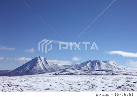 快晴の南米チリ北部、アタカマ高地の雪原から見るアンデス山脈のリカンカブール火山の絶景