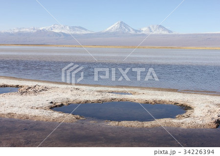 南米チリ北部のアタカマ高地、白い岩塩が露出する塩湖と雪化粧したアンデスのリカンカブール火山周辺の山々