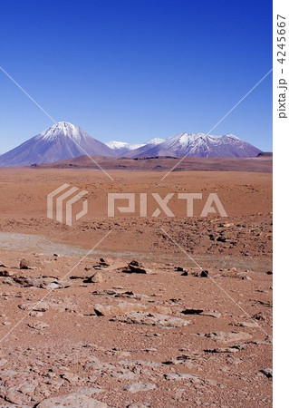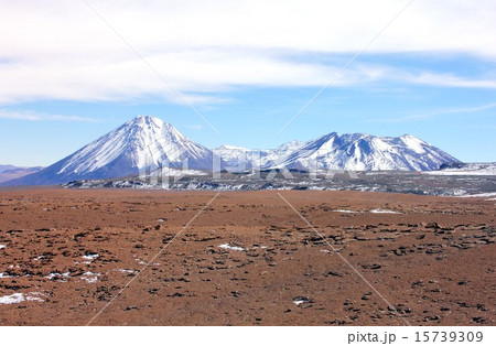 南米チリ北部、荒涼としたアタカマ高地の砂漠地帯とアンデス山脈のリカンカブール火山の美しい山並み