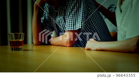 家でうなだれるミドル女性と彼を慰めるミドル男性