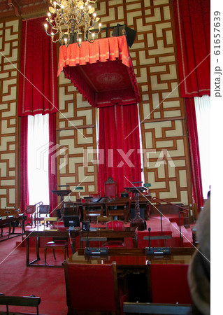 スウェーデンの首都、ストックホルムの市庁舎 議場の議長席 縦位置
