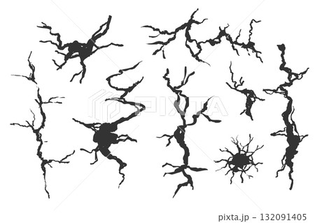 Crack wall, ground texture breaks on land surface. Ground fissure line sketch set. Crash fracture, land damage, earthquake