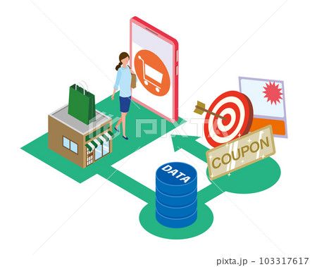 マーケティング、リアルとデジタルのサイクルイメージイラスト、ベクター