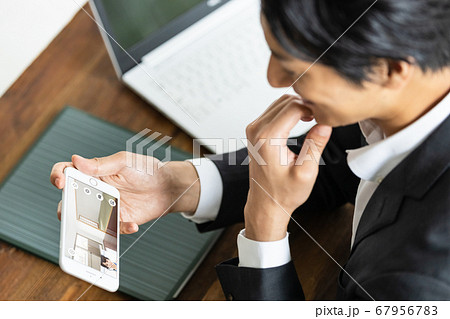 スマホで不動産物件を内見している男性(オンライン内見イメージ)