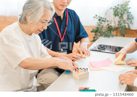 介護施設・リハビリ施設で働く作業療法士の職員とリハビリをする高齢者男女