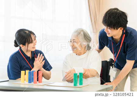リハビリをするシニア女性と介護士,作業療法士の男女スタッフ