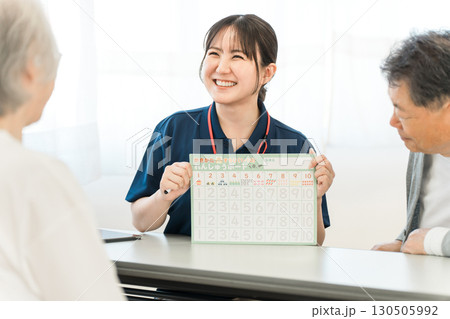 介護施設,リハビリセンターにいる介護士のスタッフとシニア男女