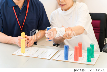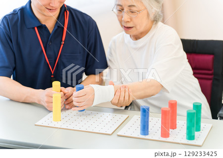 リハビリでシリンダーペグを使い手指機能訓練をするシニアと作業療法士の男女