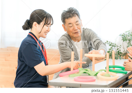 介護施設・リハビリ施設で働く作業療法士の職員とリハビリをするシニア男性