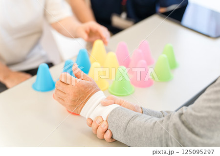 介護施設,リハビリ施設でリハビリするシニア女性の手元