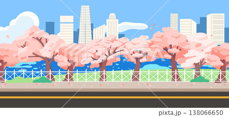 A flat vector illustration of a city street and riverside scenery with blooming cherry blossoms.