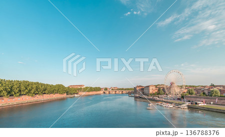 Panorama showing waterfront of Garonne River and Pont Neuf timelapse. Toulouse, France