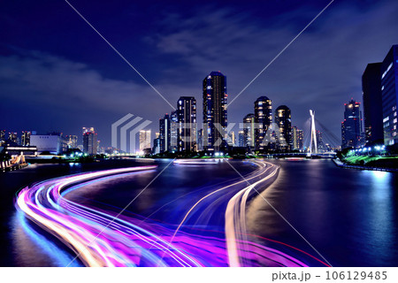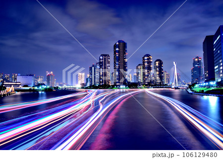 夜の永代橋からみる隅田川の屋形船の光跡と超高層マンション群の風景