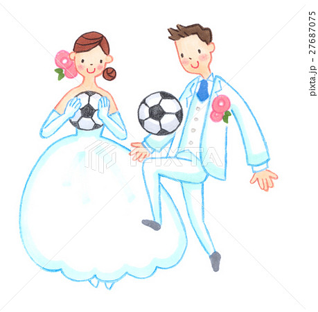 サッカーをするウェディング姿のカップル