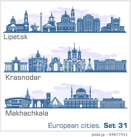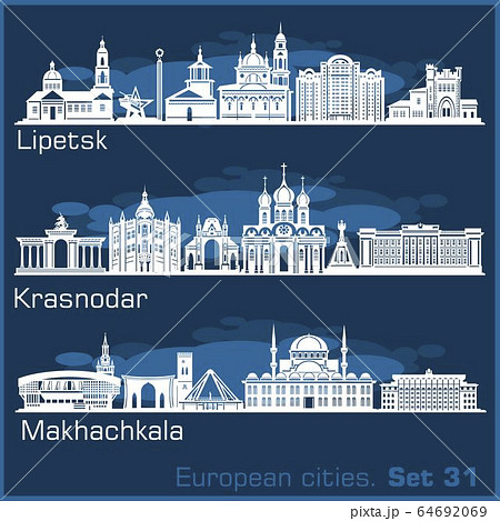 Krasnodar, Makhachkala, Lipetsk City skyline set. Russia. Vector silhouette on Blue.