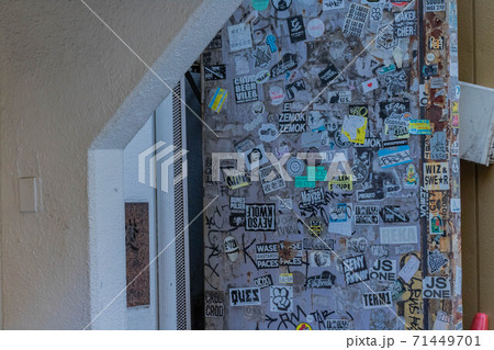 ステッカーや落書きだらけの電気設備やエアコンの室外機