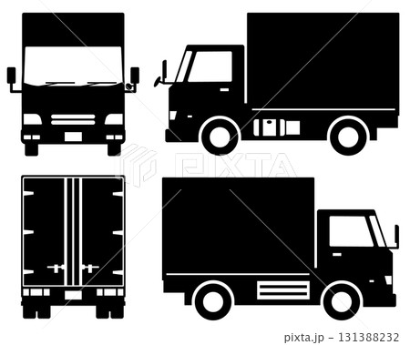 【修正版】正面、後ろ、横から見たトラックの白黒シルエット(バンボディータイプ)