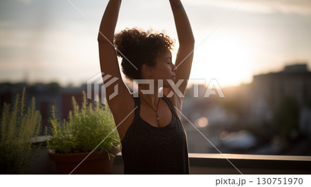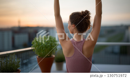 Woman practicing stretching and mindfulness on balcony at sunrise