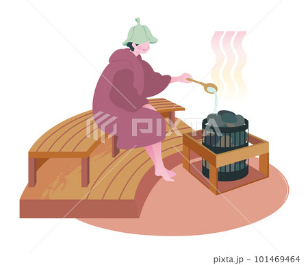 セルフロウリュを楽しむ人のイラスト サウナハット サ道