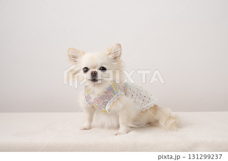ベージュバックと振袖を着たチワワのルナ