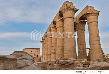 Columns and statues of the Luxor temple main entrance, first pylon, Egypt