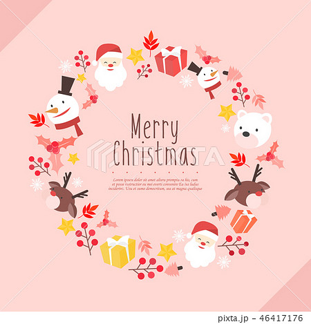 クリスマスリースの中からサンタクロースとトナカイがのぞくかわいいベクターイラスト