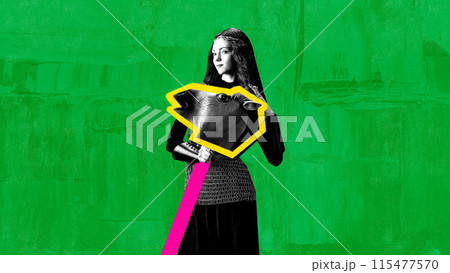 Contemporary art collage. Woman dressed in medieval armor and holding highlighted horse-toy against vibrant textured background.