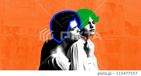 Contemporary art collage. Young man, outlined sitting on wooden desk writing poem against vibrant textured background.