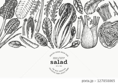 Green Vegetable Design Template. Vector Hand Drawn Healthy Leaf Salad Banner. Vintage Style Menu Illustration.