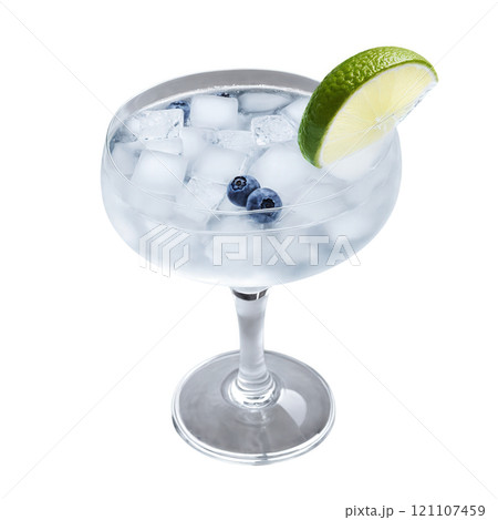 Gin and Tonic A crisp, transparent cocktail served in a wide glass filled with ice, lime wedges, and a few