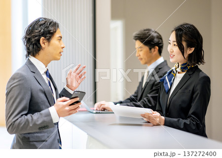 ホテルのフロントでチェックインするビジネスマン 撮影協力:WEEK芝大門(サンフロンティア不動産)