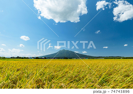 【青森県岩木山麓】岩木山と刈り取り直前の水田の風景