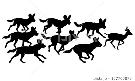 アフリカの野生犬がレイヨウを追うシルエット