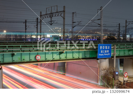 Night View of Railway Bridge with Light Trails in Seoul, South Korea