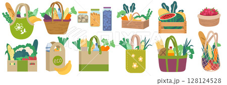 Healthy food icon. Organic market produce. Paper bag with fruit, basket with vegetables. Fresh vegan groceries, zero waste shop, bio products. ECO set. Vector cartoon flat style isolated illustration