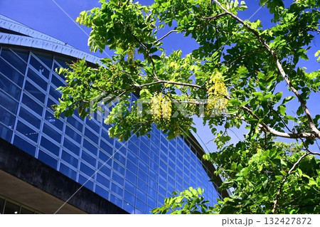 レクリエーションドームのガラス壁面とゴールデンシャワー
