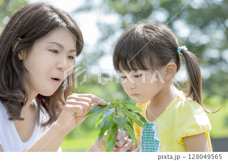 公園でどんぐりを見つめる母と娘