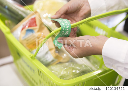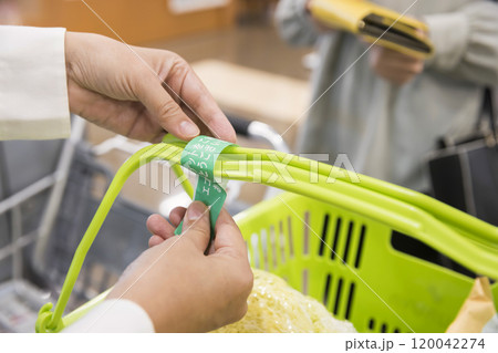 スーパーレジで購入済みテープを巻いた買い物カゴを運ぶ女性手元 レジカゴテープ