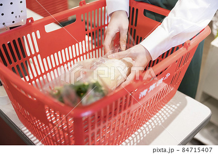 スーパーレジで購入済みテープを巻く店員手元 レジカゴテープ