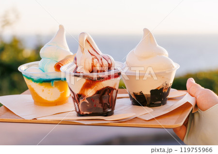 カラフルで可愛らしいソフトクリームサンデー。伊豆最南端あいあい岬の太平洋を見渡すカフェ。2024