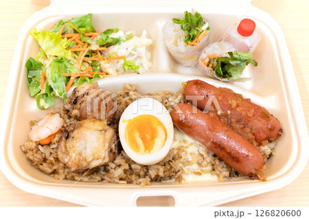おいしい玉子とソーセージと生春巻きが入ったナシゴレンのテイクアウト