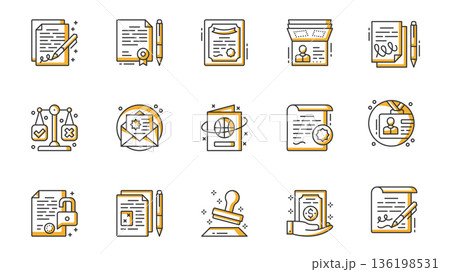 Legal documents icons set in outline stroke design for web. Pack line pictograms with signing contract, certificate, diploma, passport, justice scales, letter, id, stamp, other. Vector illustration.