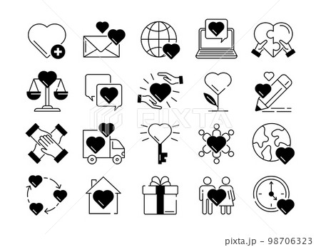 Community responsibility. Social solidarity icons. Love heart. Care service for mutual support. Volunteers assistance. Charity symbols. Ecology protection. Vector silhouette signs set