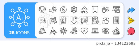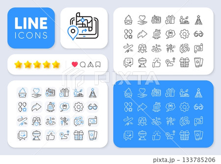 Fishing rod, Journey and Balloon dart line icons for web app. Message, Share, Like social media icons. Pack of Ice cream, Fishing float, Wedding glasses pictogram icons. Vector