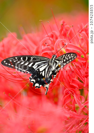 彼岸花に蜜を求め戯れるアゲハチョウ