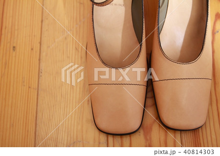 フローリングの上のレザーパンプス スクエアトゥパンプス