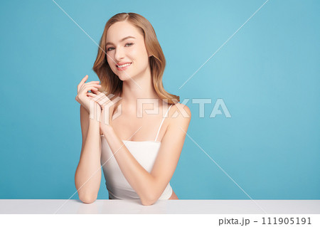 Beautiful young woman with clean fresh skin on blue background, Face care, Facial treatment, Cosmetology, beauty and spa, women portrait.