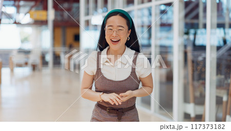 Office, building and portrait of happy Asian woman laugh for happiness, confidence and pride at company. Creative agency, modern workplace and worker with positive attitude, smile and excited for job