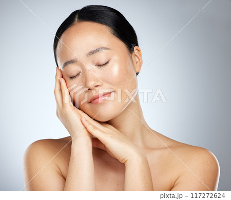 Beauty, asian woman and skincare, wellness and makeup, aesthetic cosmetics or glowing skin on studio background. Calm, natural and young Japanese female model, clean face and healthy body dermatology