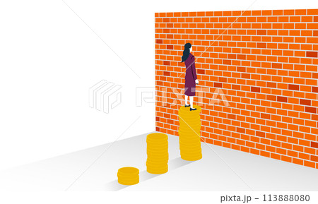 お金と壁のイラスト、お金の上に立つビジネスウーマンと高い壁、ベクター